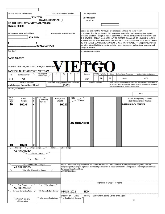 Hình ảnh vận đơn nhập khẩu gừng khô của công ty vị khách hàng ngày 04/08/2022