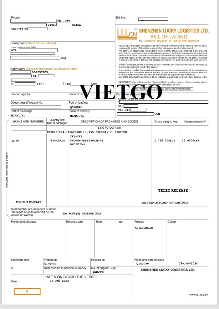 Bên cạnh các sản phẩm gỗ, ông Raymond cũng kinh doanh các mặt hàng máy móc khác. Ông đã tiến hành nhập khẩu rất nhiều sản phẩm từ nước ngoài. Dưới đây là hình ảnh bản vận đơn nhập khẩu ông đã thực hiện nhập sản phẩm máy ép chân không từ Trung Quốc tới thị trường Hoa Kỳ vào ngày 03/01/2024 vừa qua.