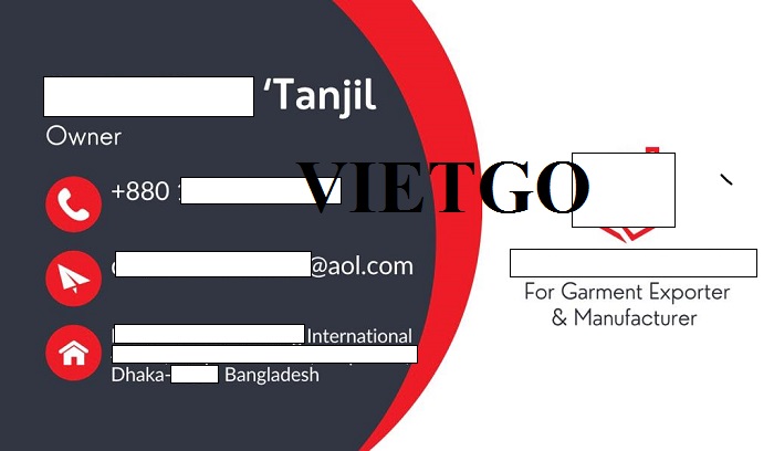 Vừa qua, VIETGO đã nhận được thông tin từ ông Tanjil về đơn hàng túi vải, phục vụ cho mục đích kinh doanh của công ty. Ông Tanjil là vị khách hàng đến từ Bangladesh và là đại diện của ██████████ International, có địa chỉ tại ██████████, Bangladesh. ██████████ International là công ty chuyên sản xuất và xuất khẩu hàng may mặc.