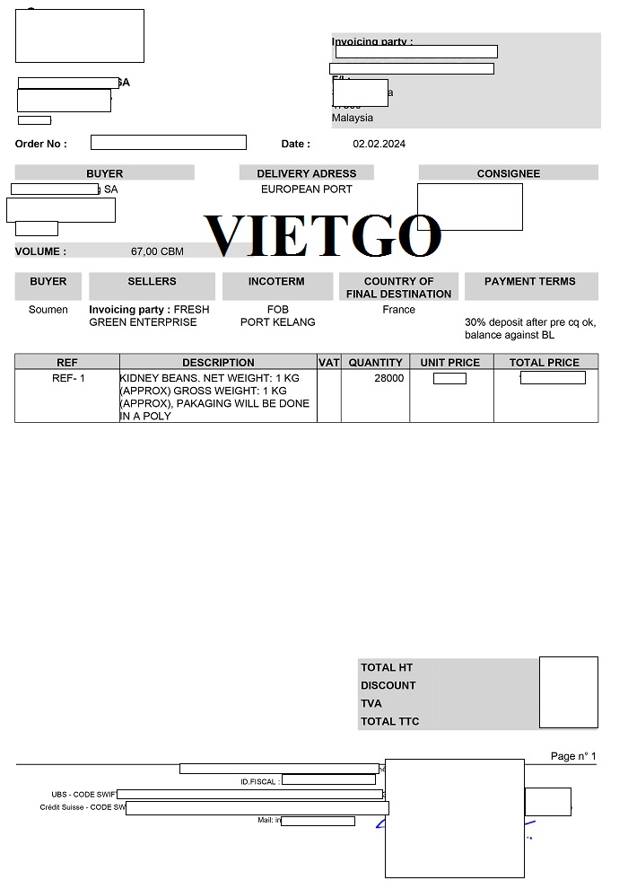 Hình ảnh đơn mua đậu thận từ Malaysia của công ty vị khách hàng