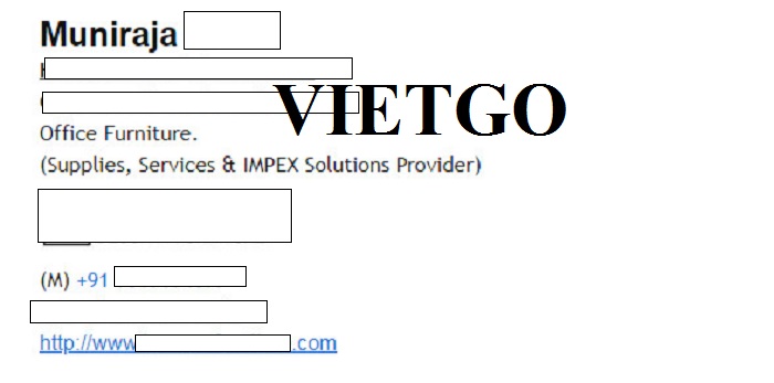 Vừa qua, ông Muniraja ██████████ đã có cuộc thảo luận với VIETGO và bày tỏ mong muốn được nhập khẩu ghế nhựa tới thị trường Ấn Độ. Ông là người đại diện của công ty ██████████ - công ty của ông Muniraja được biết đến là nhà kinh doanh sản phẩm nội thất văn phòng và ngoài trời tại Ấn Độ.