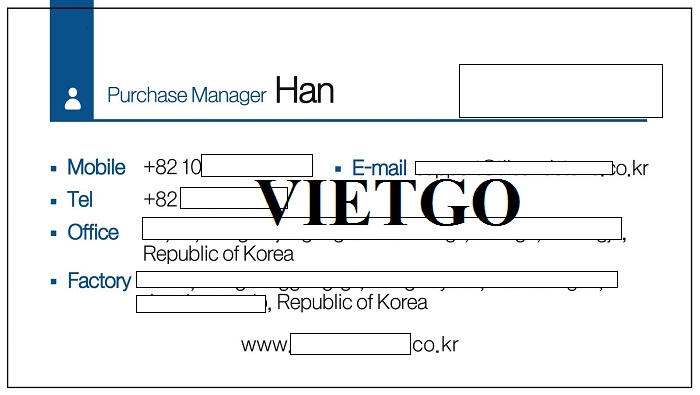 Ông Han mong muốn sớm nhận được báo giá từ các nhà cung cấp của VIETGO. Bởi vậy, Quý nhà cung cấp nào mong muốn hợp tác cùng vị khách hàng xin vui lòng liên hệ và báo giá cho ông trong thời gian sớm nhất theo thông tin dưới đây: