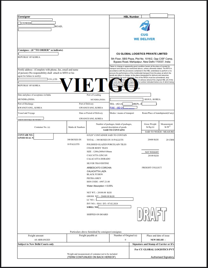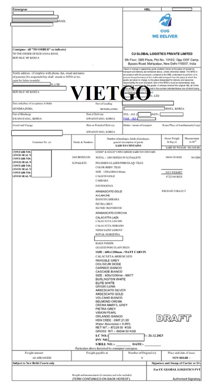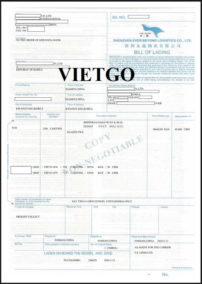 Hình ảnh vận đơn nhập khẩu sản phẩm gạch ngày 13/03/2024 và bản nháp vận đơn của công ty vị khách hàng