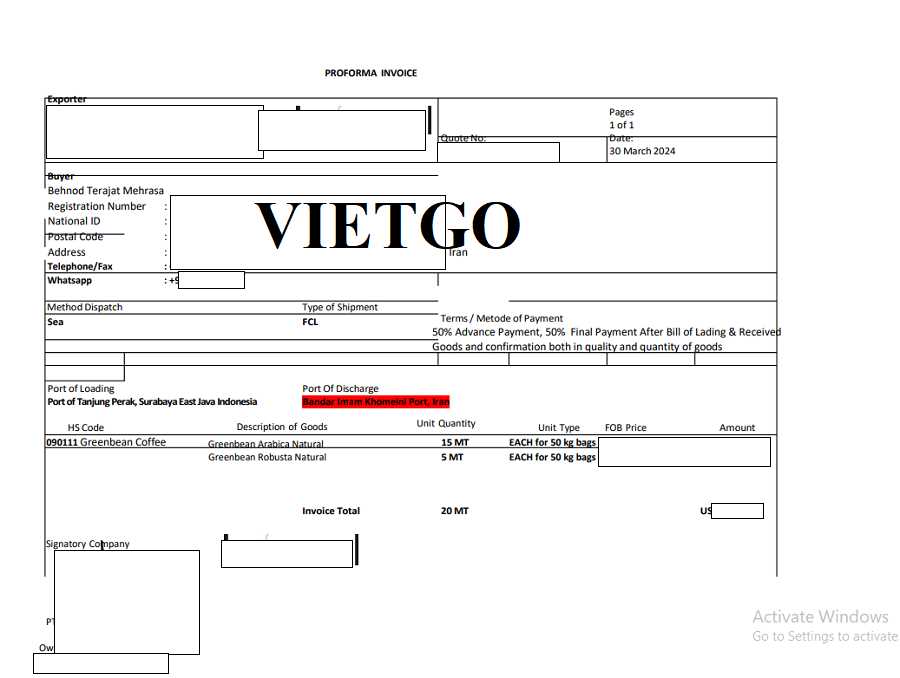 Hình ảnh hóa đơn chiếu lệ cho đơn hàng xuất khẩu cà phê sang thị trường Iran của công ty vị khách hàng