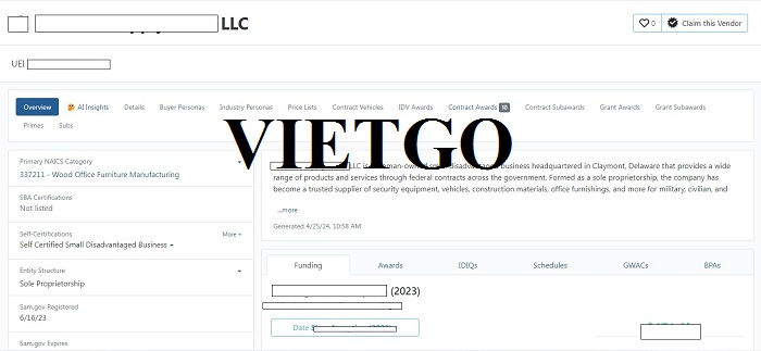██████████ LLC đã được trao nhiều hợp đồng từ Bộ Ngoại giao, Quân đội, Tư pháp và các cơ quan khác cho các sản phẩm khác nhau. Vi vậy tuy các đơn hàng có số lượng không lớn nhưng tần suất thường xuyên và rất đa dạng. Công ty đã đóng vai trò là nhà thầu chính cho các đơn đặt hàng với giá trị dao động từ vài nghìn đến hơn chín mươi nghìn đô la. Khả năng của ██████████ trong việc cung cấp nhiều loại sản phẩm cho nhiều ngành công nghiệp khác nhau đã giúp họ trở thành nhà cung cấp hàng đầu có giá trị trong các hợp đồng với nhiều khách hàng liên bang.