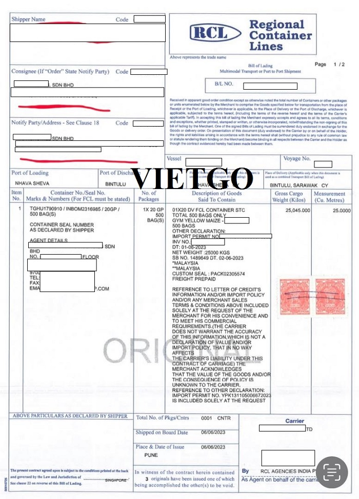 Dưới đây là hình ảnh vận đơn nhập khẩu thành công sản phẩm ngô từ Ấn Độ vào ngày 06/06/2023 của công ty vị khách hàng: