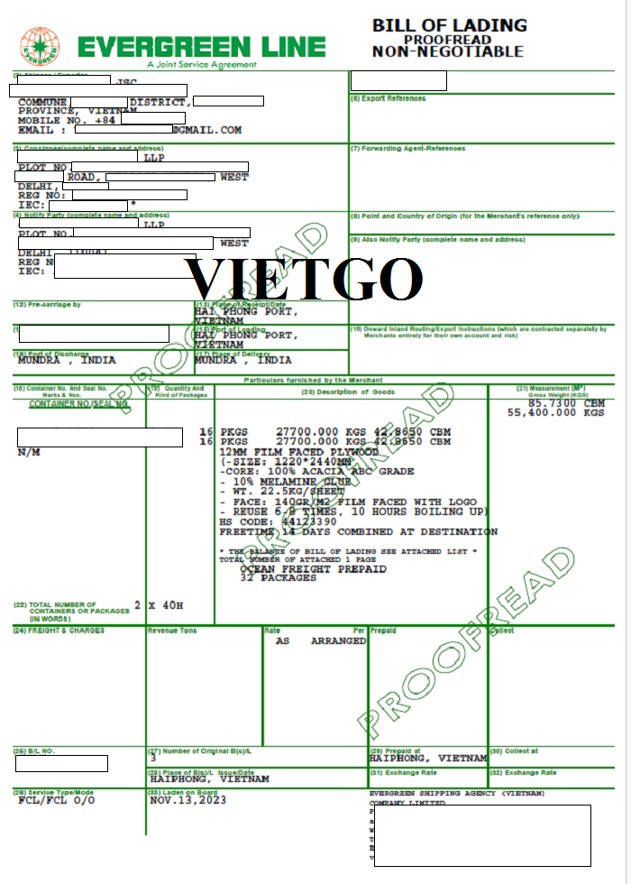 Ông Jain cũng đã từng gửi đơn hỏi hàng tới các nhà cung cấp của Vietgo trước đó và đã nhập khẩu thành công đơn hàng gỗ dán phủ phim tại Việt Nam. Dưới đây là hình ảnh bản vận đơn nhập khẩu sản phẩm gỗ dán phủ phim từ Việt Nam tới thị trường Ấn Độ vào ngày 13/11/2023 của ông Jain.