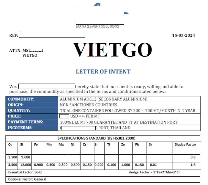 Vừa qua, VIETGO đã nhận được liên hệ từ ông Pereira – đại diện công ty ██████████ trao đổi về mong muốn tìm kiếm nhà cung cấp cho đơn hàng nhập khẩu thỏi nhôm sang thị trường Thái Lan.