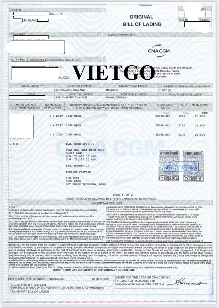 Hình ảnh vận đơn xuất khẩu gạo sang thị trường Senegal của công ty vị khách hàng