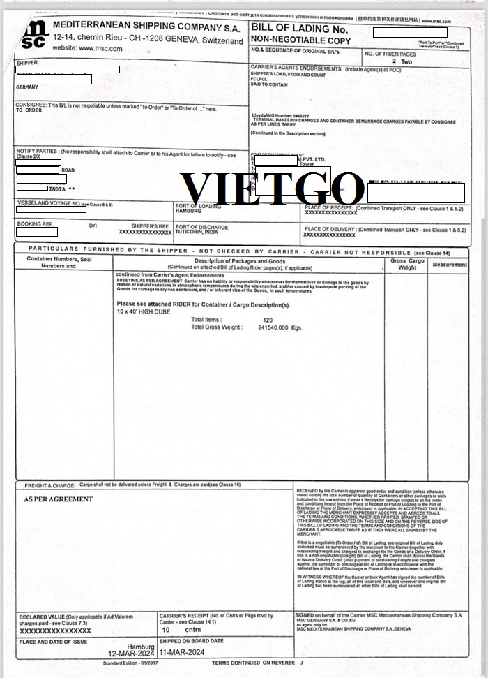 Dưới đây là hình ảnh bản vận đơn vị khách hàng đã nhập khẩu thành công sản phẩm của công ty vị khách hàng vào ngày 12 tháng 3 năm 2024 từ cảng Hamburg, Đức đến cảng Tuticorin, Ấn Độ.