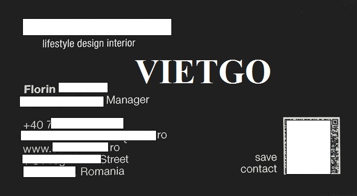 Qua cuộc trò chuyện về yêu cầu đơn hàng, VIETGO đánh giá cao thiện chí hợp tác của ông Florin với nhà cung cấp tại khu vực châu Á cho các dự định sắp tới. Rất mong Quý nhà cung cấp quan tâm tới đơn hàng có thể sớm liên lạc và báo giá với ông trong thời gian sớm nhất. Quý nhà cung cấp vui lòng liên hệ với ông Florin qua các thông tin dưới đây để nhanh chóng báo giá và xuất khẩu thành công đơn hàng hấp dẫn này.