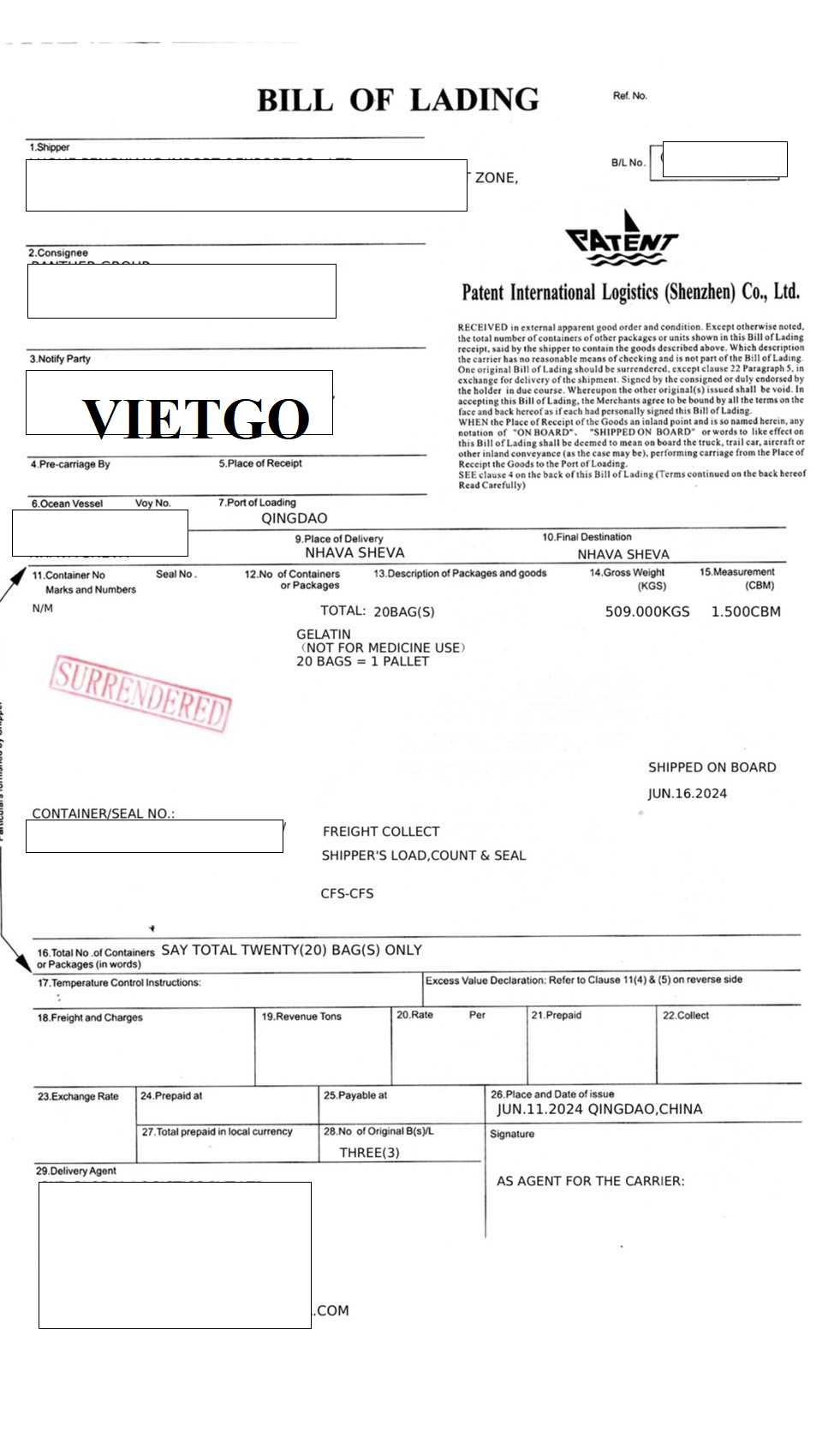Dưới đây là hình ảnh bản vận đơn vị khách hàng đã nhập khẩu thành công sản phẩm của công ty vị khách hàng vào ngày 11 tháng 6 năm 2024 từ cảng Qingdao, Trung Quốc đến cảng Nhava Sheva, Ấn Độ.
