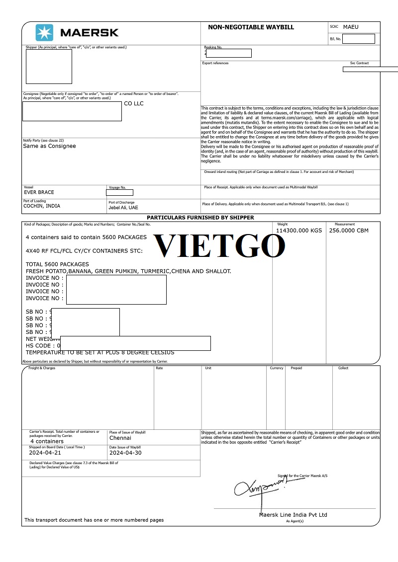 Dưới đây là hình ảnh bản vận đơn nhập khẩu khoai tây, chuối, khoai nưa, bí xanh, nghệ và hành từ Ấn Độ vào tháng 4/2024 của công ty vị khách hàng: