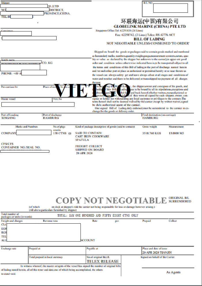 Hình ảnh vận đơn nhập khẩu của công ty vị khách hàng từ thị trường Trung Quốc vào ngày 20/4/2024