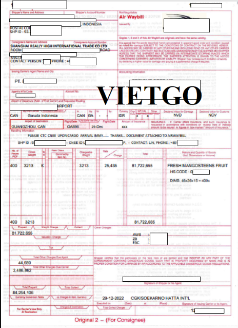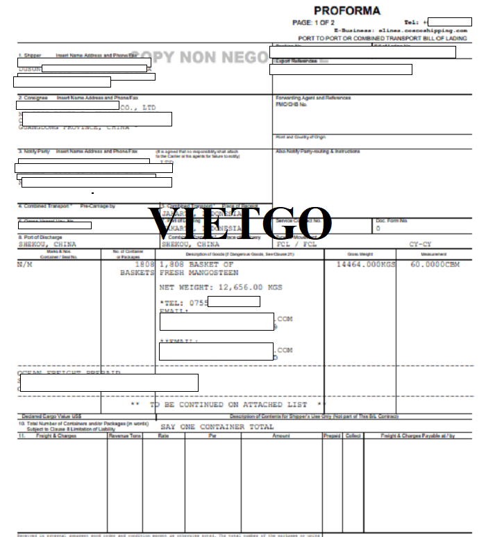 Hình ảnh bản vận đơn xuất khẩu măng cụt sang Trung Quốc