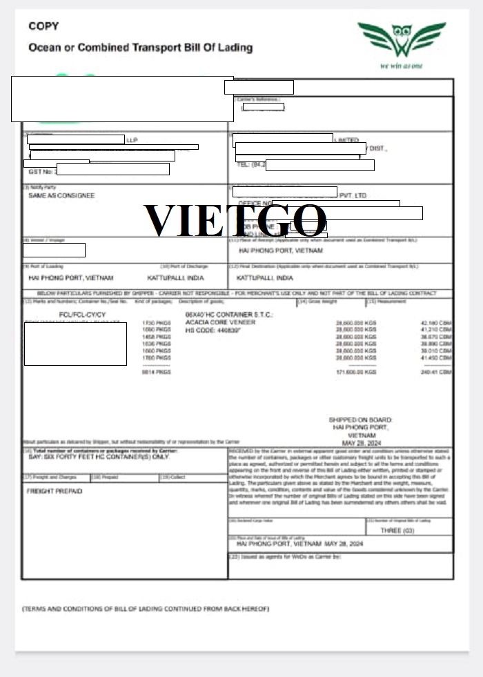 Dưới đây là hình ảnh bản vận đơn vị khách hàng đã nhập khẩu thành công sản phẩm ván bóc vào ngày 28 tháng 5 năm 2024 từ cảng Hải Phòng, Việt Nam đến cảng Kattupalli, Ấn Độ.