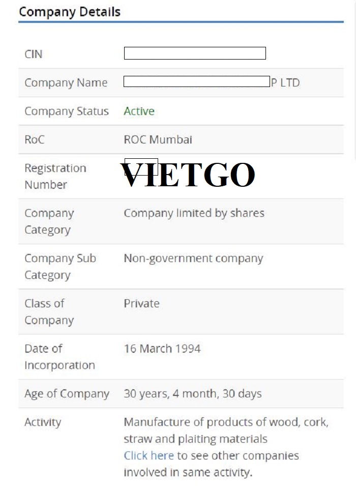 ██████████ có mã số nhận dạng doanh nghiệp của là (CIN) ██████████ và số đăng ký là ██████████, công ty có địa chỉ tại ██████████, Maharashtra, Ấn Độ - 421303. Đây là một công ty tư nhân được thành lập vào ngày 16 tháng 3 năm 1994 và được phân loại là công ty phi chính phủ và được đăng ký tại Cơ quan đăng ký công ty, ROC Mumbai. Vốn cổ phần được ủy quyền của công ty là 10.000.000 Rupee và vốn đã thanh toán là 5.624.200 Rupee. Công ty tham gia vào Sản xuất các sản phẩm từ gỗ, nút chai, rơm rạ và vật liệu tết bện.