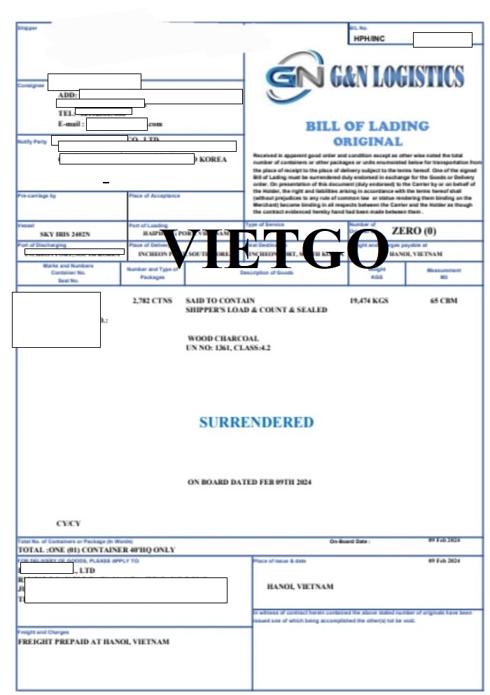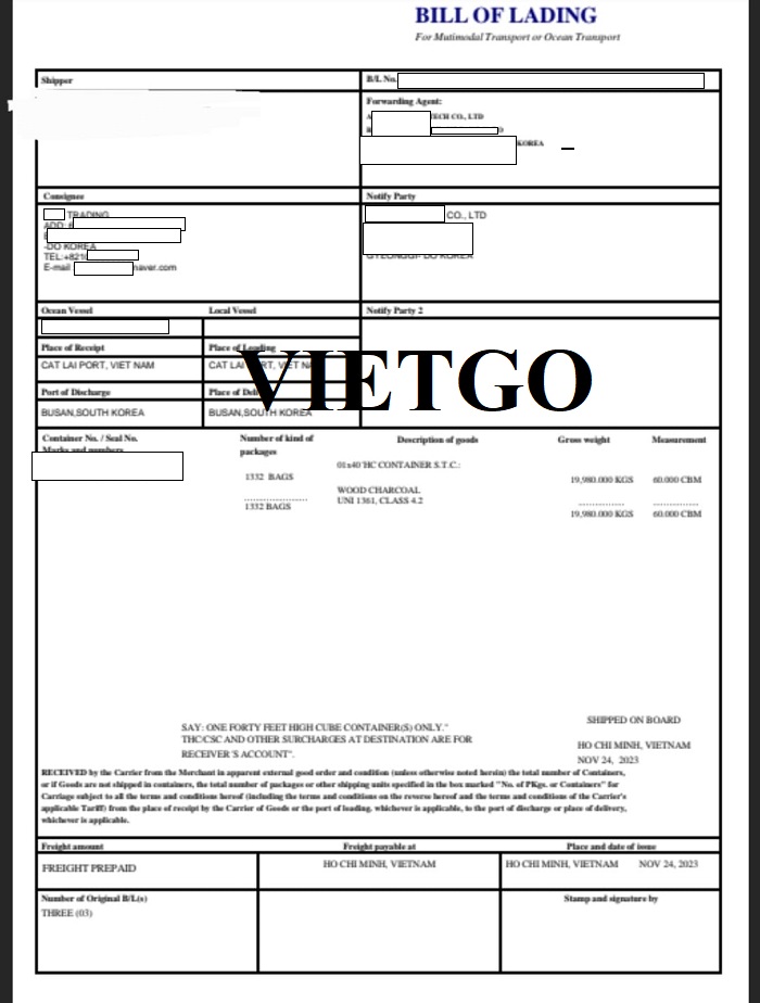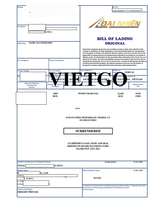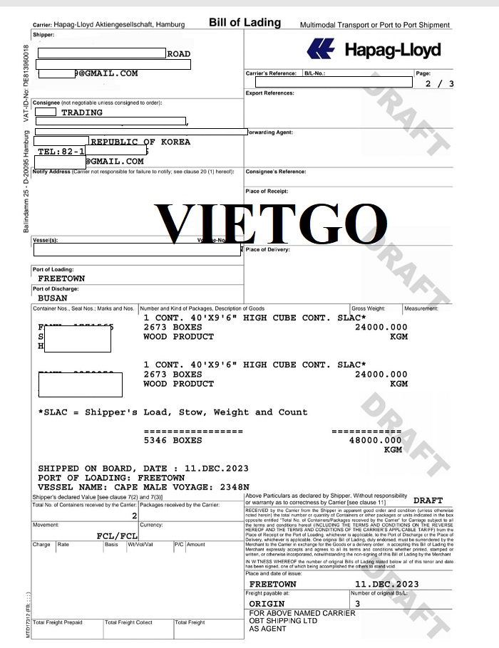 Hình ảnh bản vận đơn nhập khẩu sản phẩm gỗ từ Sierra Leone sang Hàn Quốc của công ty anh Cheol trong tháng 12/2023