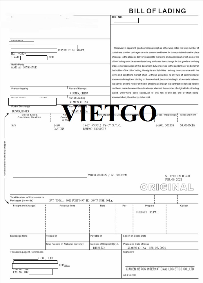 Hình ảnh bản vận đơn nhập khẩu sản phẩm tre từ Trung Quốc sang Hàn Quốc của công ty anh Cheol trong tháng 2/2024