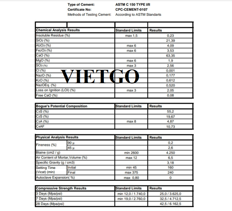 Yêu cầu: Xi măng ASTM C150 loại 1 và 2 có chất lượng tốt