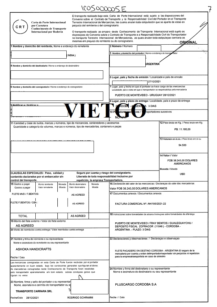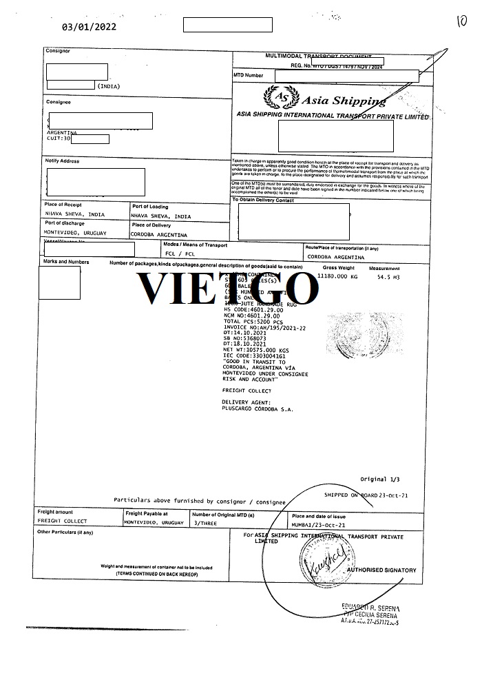 Vận đơn nhập khẩu thảm trải sàn từ Ấn Độ của vị khách hàng
