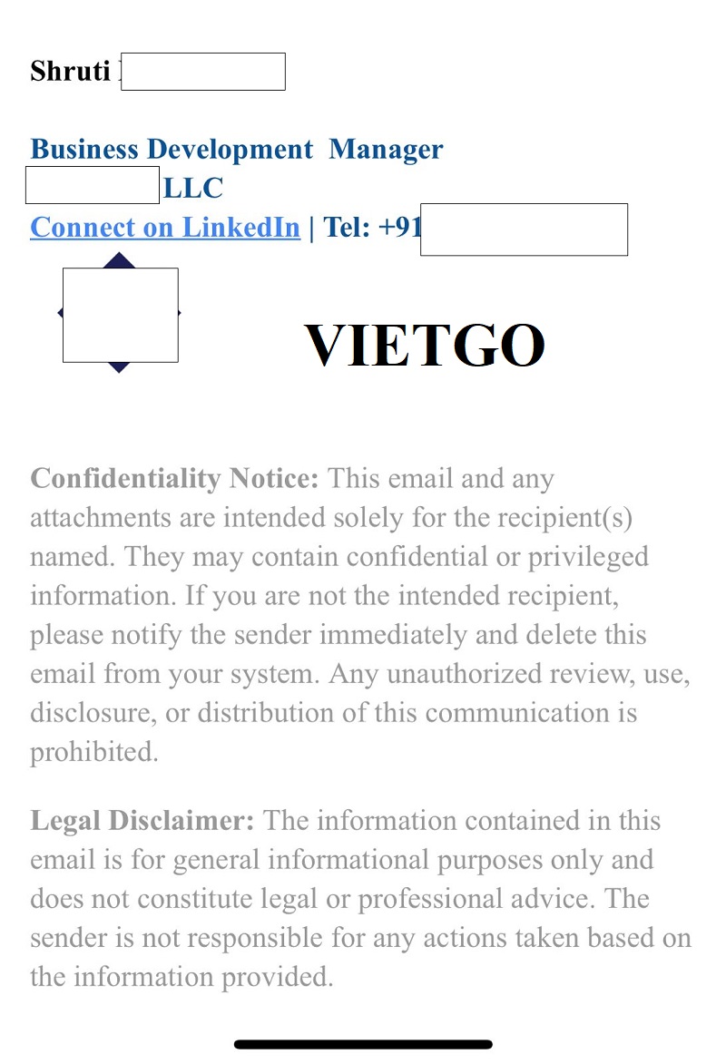 Bà Shruti – vị khách hàng của VIETGO lần này là đại diện mua hàng đến từ công ty ██████████Ltd. Tại ██████████Ltd., công ty chuyên thúc đẩy thành công cho khách hàng thông qua một bộ dịch vụ toàn diện được thiết kế để đáp ứng nhu cầu năng động của thị trường toàn cầu. Chuyên môn của công ty trải rộng trên nhiều lĩnh vực, đảm bảo có thể cung cấp các giải pháp toàn diện và sáng tạo phù hợp với nhu cầu cụ thể của đối tác, khách hàng. Một số dịch vụ cốt lõi của ██████████Ltd. có thể kể đến như tư vấn chiến lược, thu hút vốn, quan hệ nhà đầu tư, giải pháp thương mại toàn cầu, tư vấn đầu tư, dịch vụ công cụ tài chính.