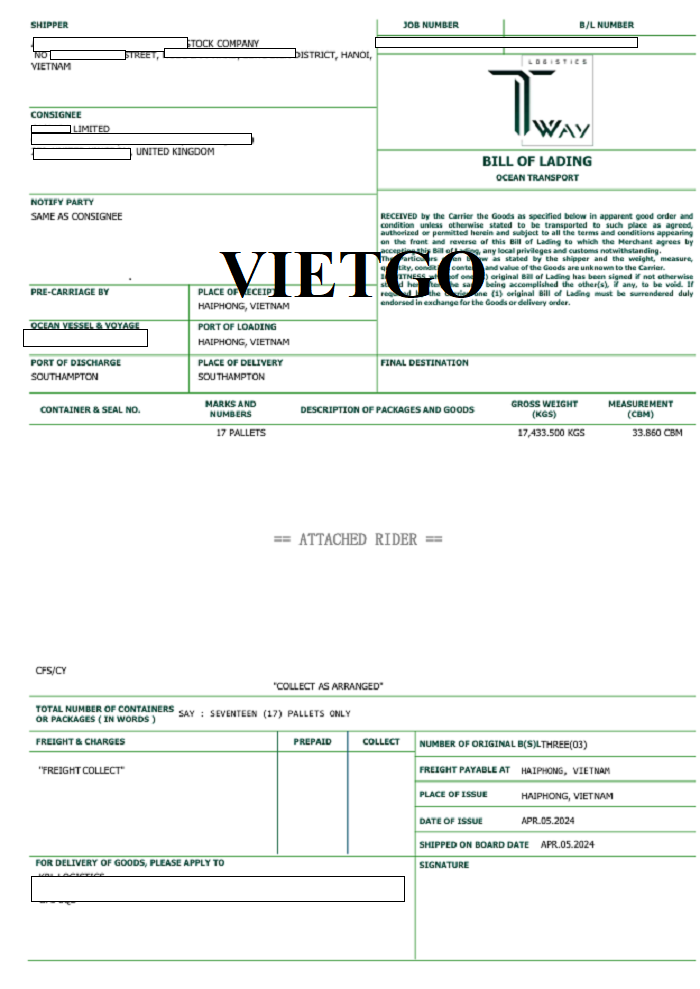 Hình ảnh vận đơn nhập khẩu từ thị trường Việt Nam của công ty vị khách hàng vào ngày 5/4/2024