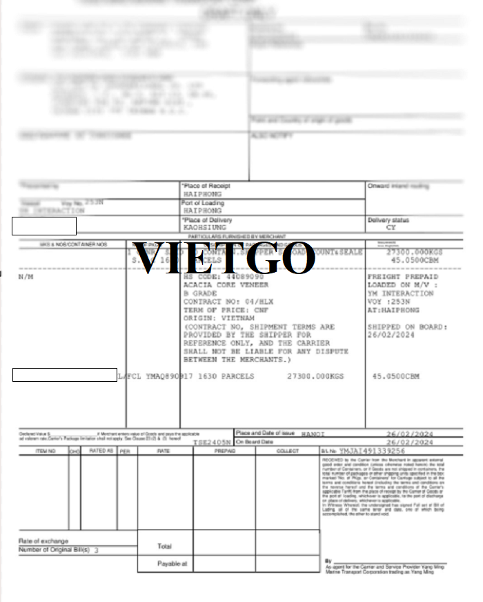 Bản vận đơn nhập khẩu ván bóc của công ty vị khách hàng từ Việt Nam vào tháng 02/2024