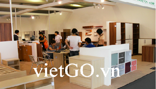 Hình ảnh gian hàng giới thiệu sản phẩm của công ty tại một triển lãm đồ nội thất.