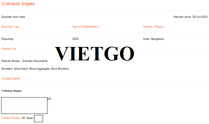 Ông Sean – đại diện đến từ Ấn Độ, hiện đang làm việc tại công ty ██████████ đã liên hệ với VIETGO trao đổi về mong muốn tìm kiếm nhà cung cấp cho đơn hàng nhập khẩu đá xây dựng sang thị trường Bangladesh và Malaysia.