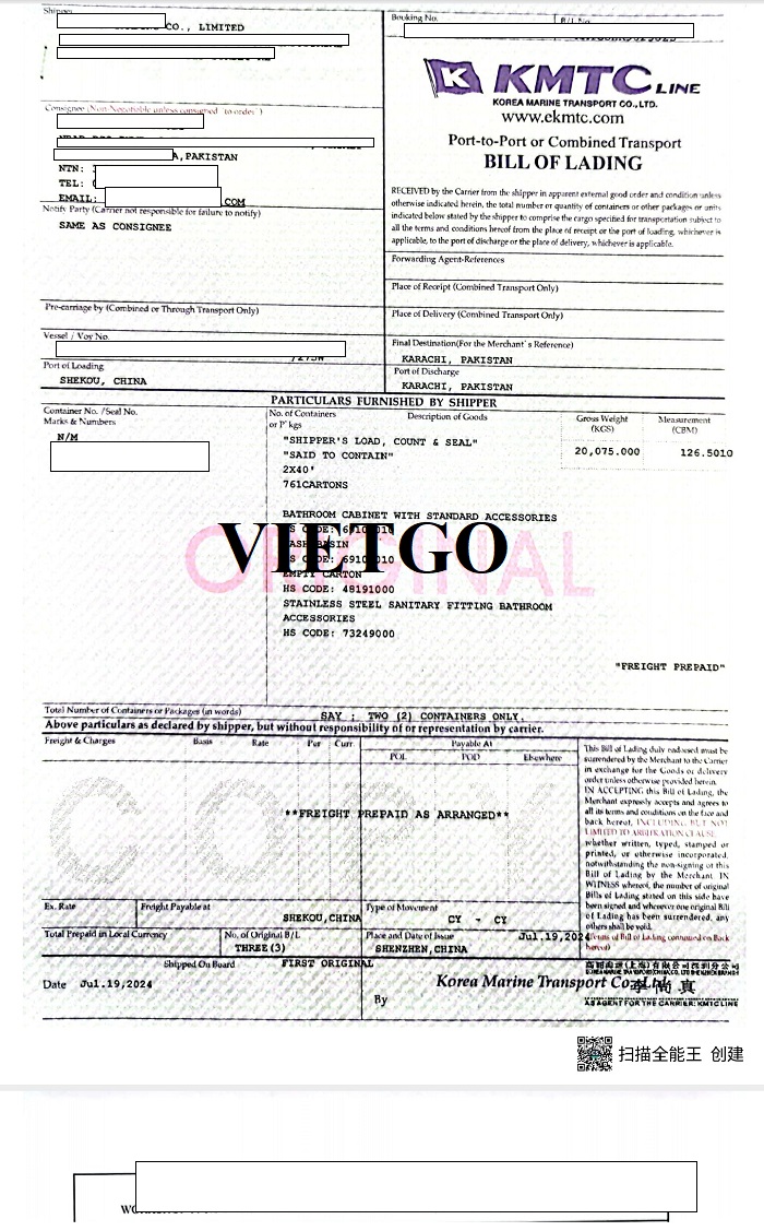 Hình ảnh bản vận đơn nhập khẩu, ông Irfan đã tiến hành nhập khẩu tủ nhà tắm từ thị trường Trung Quốc tới Pakistan vào ngày 19 tháng 7 năm 2024