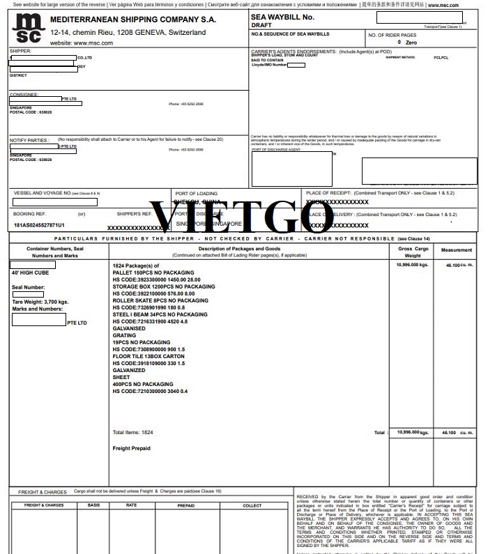 Hình ảnh bản vận đơn vị khách hàng nhập khẩu thành công sản phẩm pallet từ cảng Shekou, Trung Quốc đến cảng Singapore, Singapore