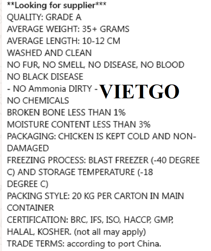VIETGO xin gửi tới các nhà cung cấp thông tin về nhu cầu nhập khẩu sản phẩm chân gà của ông Ferrer. Vị khách hàng rất mong muốn tìm được đối tác kinh doanh trong thời gian sớm nhất.