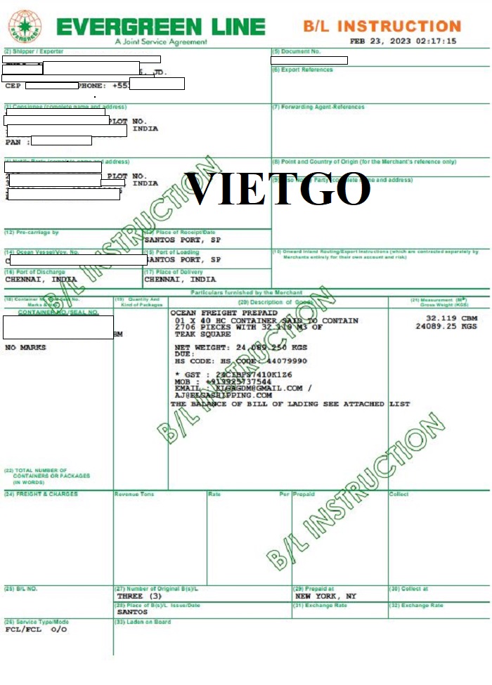 Hình ảnh bản vận đơn của chuyến hàng ông Anil nhập khẩu thành công 1 container 40HC sản phẩm ván ép hộp từ Brazil đến Ấn Độ