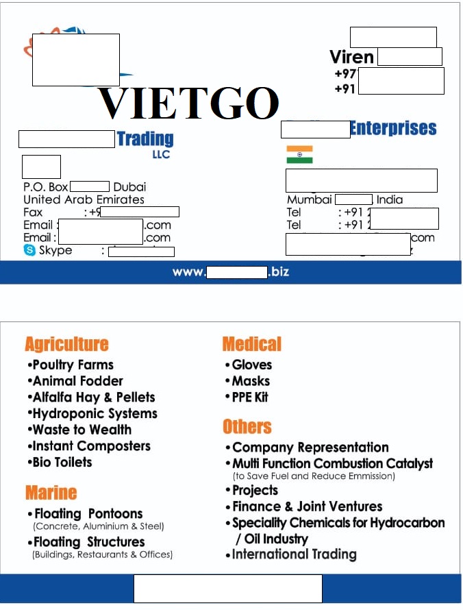 Ông Viren ██████████ - vị khách hàng của VIETGO lần này đại diện mua hàng đến từ Ấn Độ. Hiện tại ông đang sinh sống và làm việc tại Dubai, UAE. Ông đang làm việc tại 2 công ty đó là ██████████, có trụ sở tại UAE và ██████████ có trụ sở tại Ấn Độ. Đây là công ty chuyên cung cấp sản phẩm như thức ăn chăn nuôi, găng tay, khẩu trang, thuyền và một số dịch vụ khác. Ông muốn nhập khẩu một số lượng lớn chân gà để xuất khẩu sang Trung Quốc trong vòng 1 năm để đáp ứng nhu cầu tiêu thụ tại đây. Trung Quốc là một thị trường tiêu thụ chân gà lớn do đó công ty đã nắm bắt cơ hội để nhập khẩu chân gà từ các quốc gia lớn như Brazil, Thái Lan,...