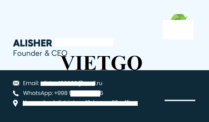 Ông Alisher hiện đang là Giám đốc và nhà sáng lập của công ty ██████████. ██████████, một công ty thương mại được thành lập vào năm 2008, có trụ sở tại quận Yunusabad, Uzbekistan. Lĩnh vực chính mà công ty đảm nhận là kinh doanh những sản phẩm tiện ích và hữu dụng cho người tiêu dùng, luôn hướng tới đóng góp cho xã hội và cố gắng cung cấp các dịch vụ nhằm thỏa mãn nhu cầu của người tiêu dùng trong nước và xuất khẩu ra thị trường quốc tế. Bên cạnh đó, công ty đang ngày càng đa dạng hóa hoạt động kinh doanh của mình, phát triển thêm nhiều lĩnh vực mới như lĩnh vực nhà hàng, bán đồ ăn, cung cấp phụ kiện... và tích cực hợp tác với các công ty lớn trên thế giới như một liên minh hoặc một đối tác cạnh tranh để không ngừng hướng tới mục tiêu cải tiến sản phẩm và dịch vụ.