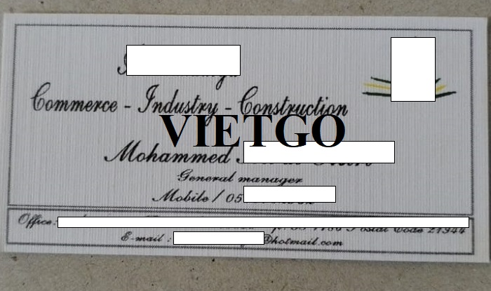 Qua cuộc trò chuyện và chia sẻ, VIETGO nhận thấy ông Mohammed là vị khách hàng rất thân thiện. Ông bày tỏ sự thiện chí và hy vọng thông qua đề xuất của VIETGO có thể giúp ông kết nối với các nhà cung cấp uy tín, có sản phẩm chất lượng và giá cả hợp lý, mở rộng mạng lưới cung ứng trong tương lai. Cách đây ít tháng vị khách hàng cũng đã từng liên hệ VIETGO để tìm nhà cung cấp, tuy nhiên do nhu cầu kinh doanh liên tục nên vị khách hàng đã liên hệ lại VIETGO để tìm kiếm thêm nhà cung cấp tiềm năng. Quý nhà cung cấp nào có thể đáp ứng cho đơn hàng của ông Mohammed, vui lòng liên hệ với vị khách hàng để có thể thực hiện đơn hàng trong thời gian sớm nhất.