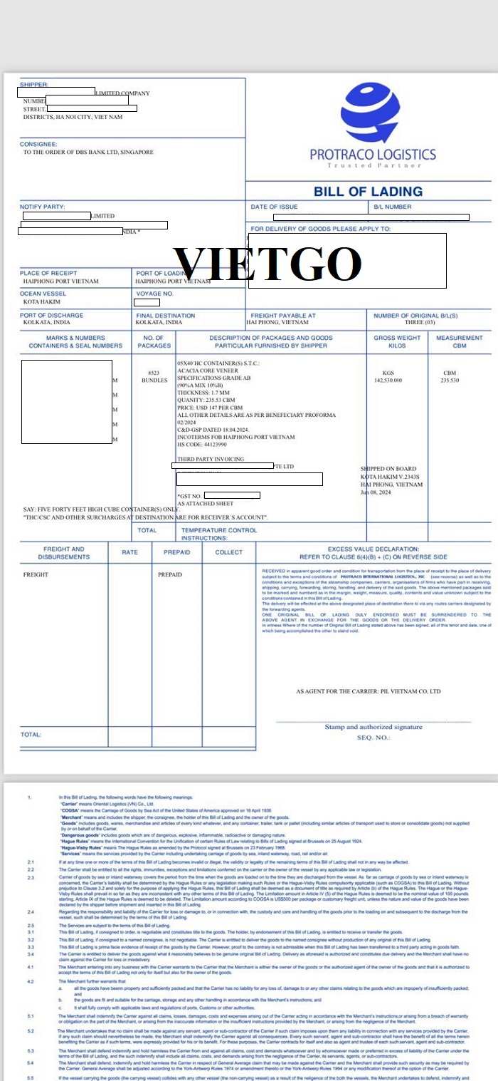 Dưới đây là hình ảnh bản vận đơn vị khách hàng đã nhập khẩu thành công sản phẩm ván bóc vào ngày 8 tháng 6 năm 2024 từ cảng Hải Phòng, Việt Nam đến cảng Kolkata, Ấn Độ.