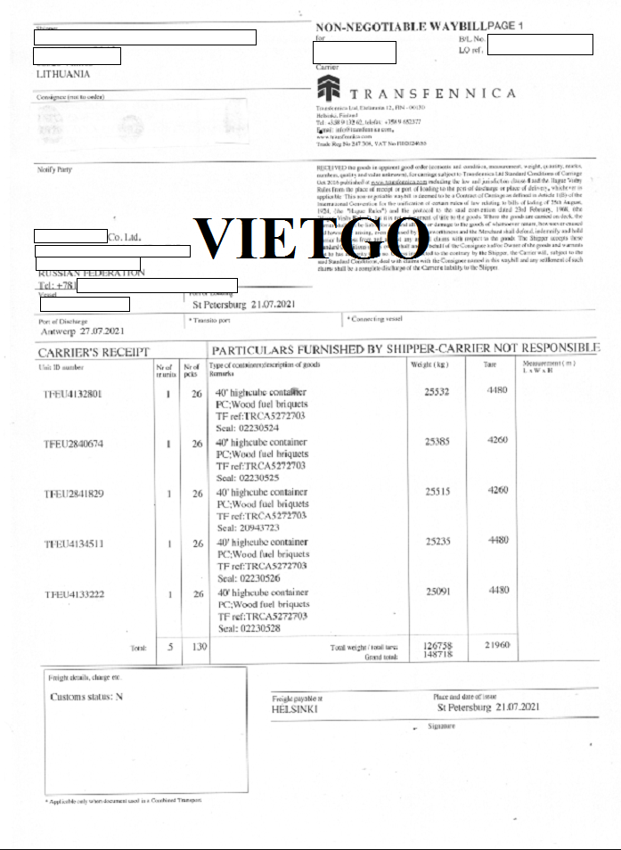 Hình ảnh vận đơn nhập khẩu củi mùn cưa ép từ Nga sang Bỉ do công ty vị khách hàng thực hiện vào 21/07/2021