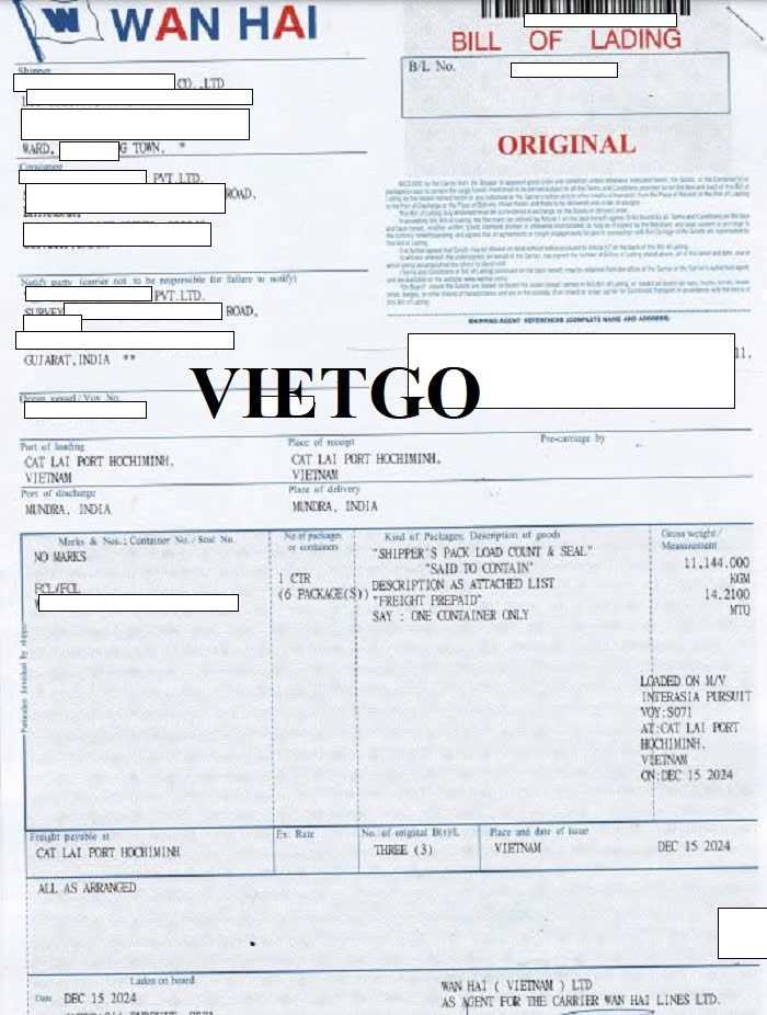 Hình ảnh bản vận đơn khách hàng nhập khẩu ván bóc từ Việt Nam ngày 15/12/2024