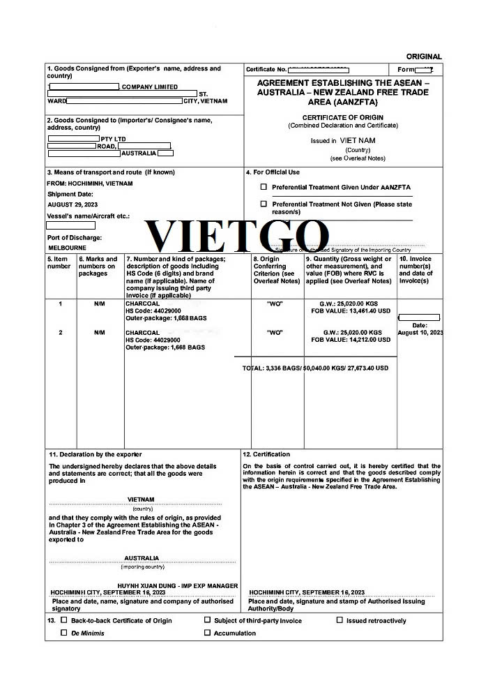 Dưới đây là bộ chứng từ cho đơn hàng nhập khẩu than củi từ Việt Nam sang Úc mà công ty ông đã thực hiện thành công:
