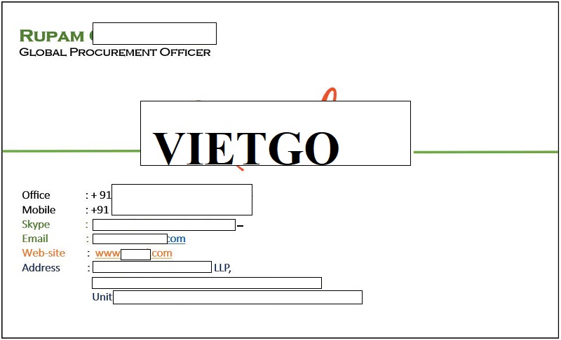 Ông Rupam mong muốn nhanh chóng nhận được báo giá từ các nhà cung cấp của VIETGO. Bởi vậy, quý nhà cung cấp mong muốn hợp tác cùng vị khách hàng xin vui lòng liên hệ và báo giá cho ông trong thời gian sớm nhất theo thông tin dưới đây: