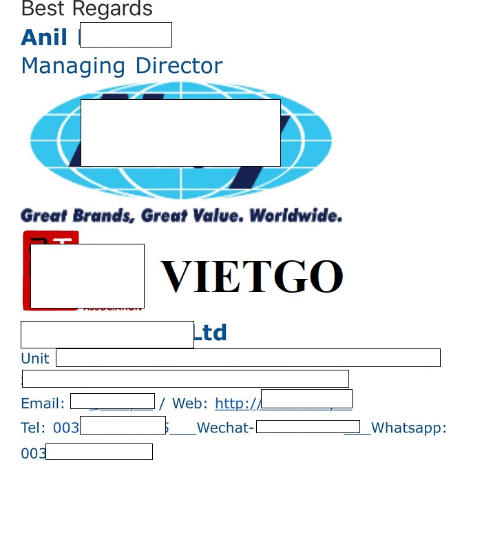 Vậy, Quý nhà cung cấp nào có thể đáp ứng được yêu cầu của ông Anil, vui lòng liên hệ và báo giá với ông qua địa chỉ thông tin liên lạc dưới đây: