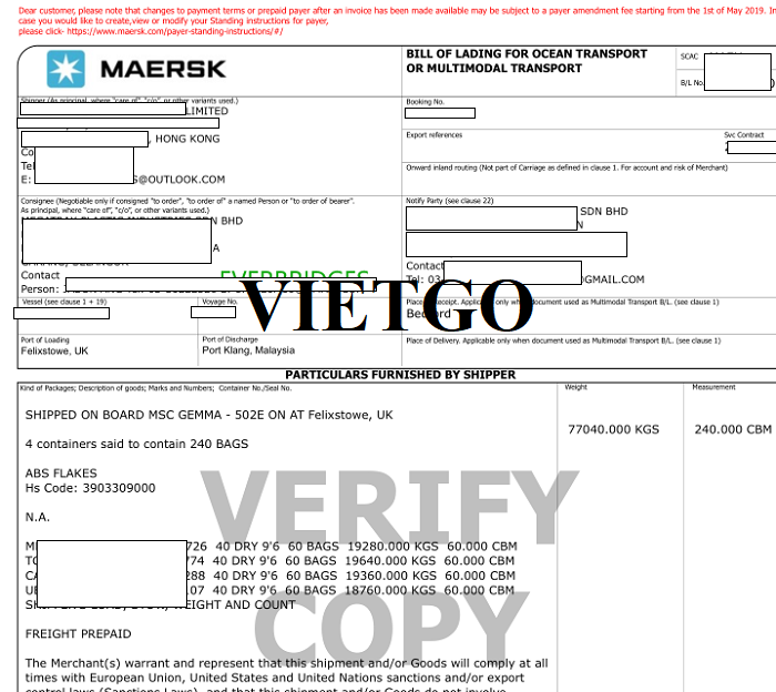 Dưới đây là hình ảnh bản vận đơn vị khách hàng đã nhập khẩu thành công sản phẩm vụn nhựa từ cảng Felixstowe, Anh đến cảng Port Klang, Malaysia và từ cảng Barcelona, Tây Ban Nha đến cảng Port Klang, Malaysia.