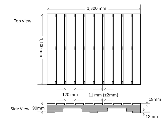 Kích thước dưới pallet theo chiều dọc: 120mm x 1100mm x 18mm x 3ea