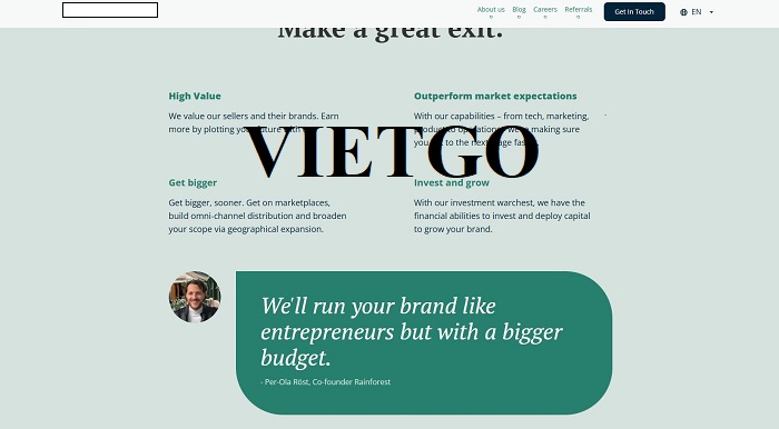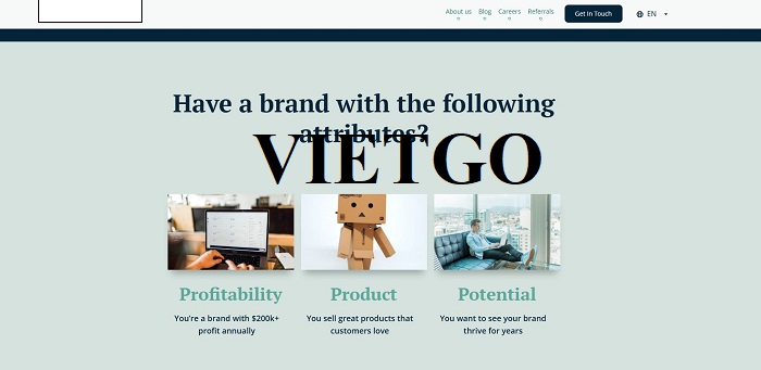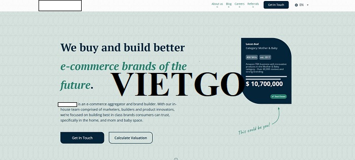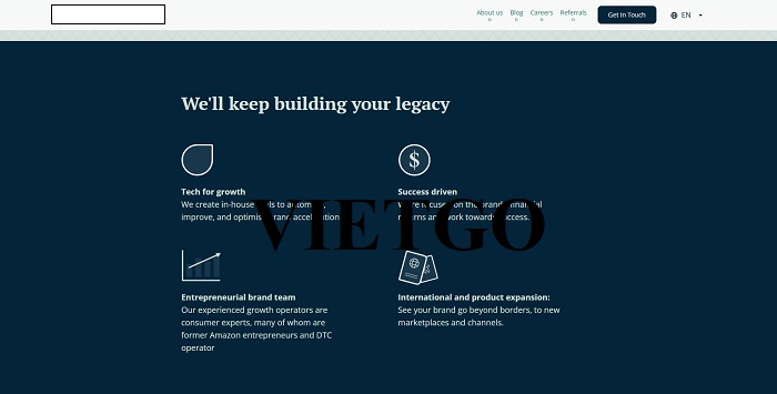 Bên cạnh việc phát triển thương hiệu, ██████████ còn cung cấp các giải pháp toàn diện cho các doanh nghiệp thương mại điện tử, bao gồm đánh giá, mua lại, tối ưu hóa vận hành và mở rộng thị trường. Nhờ vào công nghệ tiên tiến, công ty có thể tự động hóa quy trình tăng trưởng và thúc đẩy sự phát triển xuyên biên giới. Đội ngũ lãnh đạo của công ty bao gồm những cá nhân có nhiều năm kinh nghiệm trong lĩnh vực thương mại điện tử, từng giữ các vị trí quan trọng tại những công ty lớn như Amazon, Airbnb, Carousell, Fave và Ovo. Họ cùng chia sẻ một mục tiêu chung: xây dựng các thương hiệu vững mạnh và mang lại giá trị bền vững cho khách hàng trên toàn cầu.