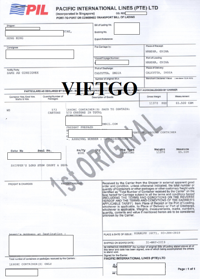 Dưới đây là hình ảnh bản vận đơn vị khách hàng đã nhập khẩu thành công sản phẩm của công ty vào ngày 31 tháng 5 năm 2019 từ cảng Nansha, Trung Quốc đến cảng Kolkata, Ấn Độ.