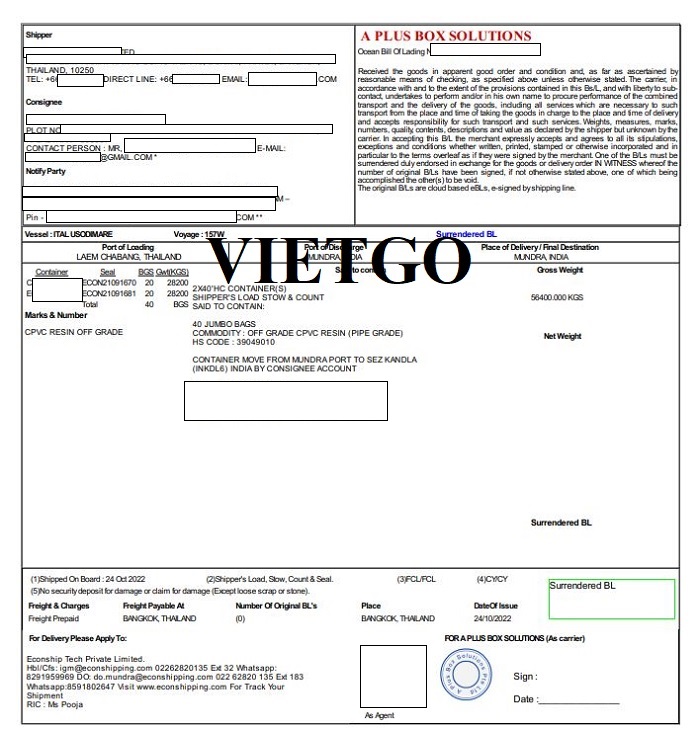 Hình ảnh bản vận đơn nhập khẩu công ty đã thực hiện nhập khẩu sản phẩm hạt nhựa từ Thái Lan tới Ấn Độ vào năm 2022