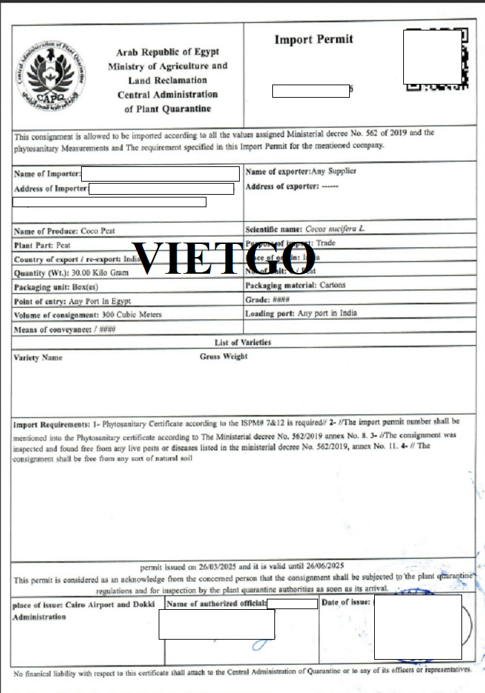 Hình ảnh giấy phép nhập khẩu xơ dừa của vị khách hàng