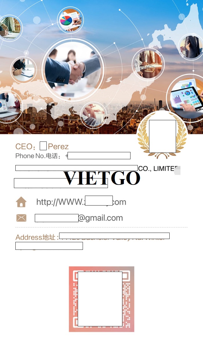 Bà ██████████ Perez - vị khách hàng của VIETGO lần này đại diện mua hàng đến từ Trung Quốc. Hiện tại bà đang làm việc và sinh sống ở Mỹ. Bà là Giám đốc của công ty ██████████ Co, Limited, có trụ sở tại Mỹ và Trung Quốc. Đây là chi nhánh của công ty ██████████. Với trình độ chuyên môn trong lĩnh vực thương mại hàng rời quốc tế, công ty đã nhanh chóng vươn lên trong lĩnh vực thương mại chuyên nghiệp để tìm kiếm sự phát triển và cung cấp các dịch vụ đa dạng cho khách hàng. Công ty có chuỗi cung ứng hàng hóa lớn tại các nước châu Phi, châu Âu và châu Á đồng thời họ cũng khai thác sâu thị trường Trung Quốc.